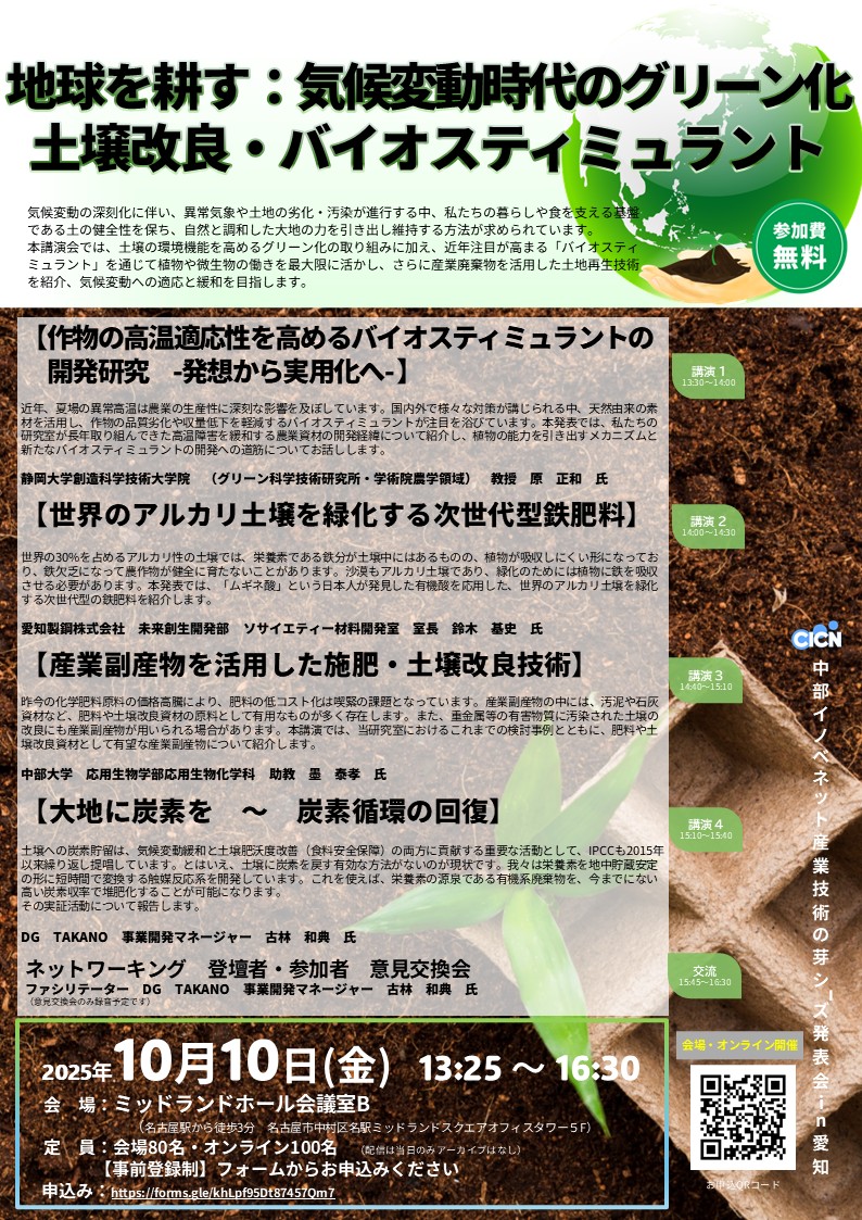10/10 中部イノベネット産業技術の芽シーズ発表会in愛知 「地球を耕す:気候変動時代のグリーン化 土壌改良・バイオスティミュラント」