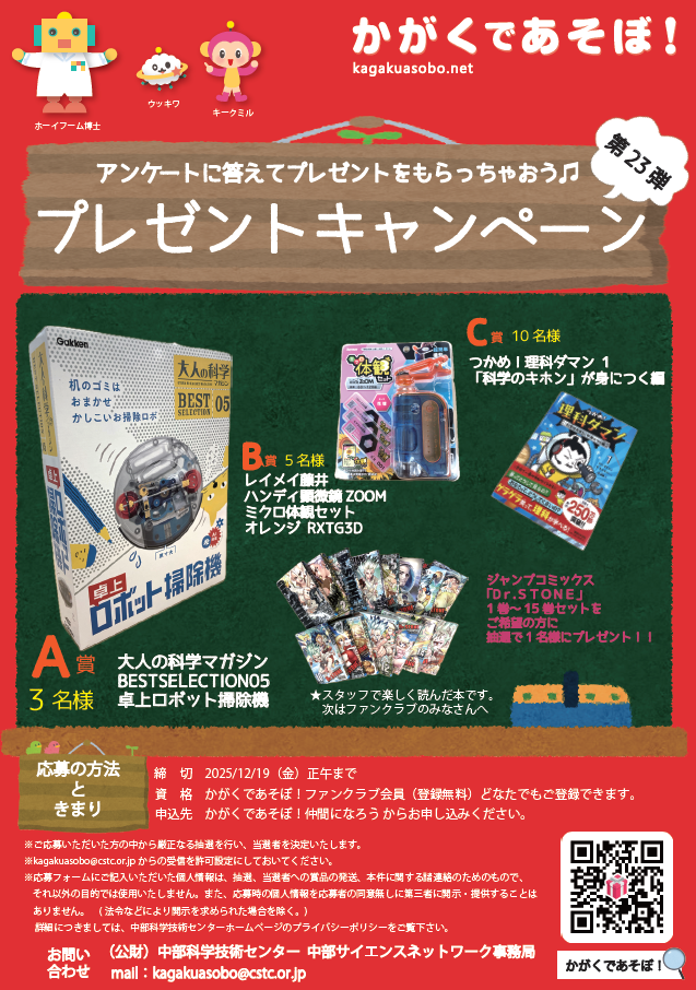 ※応募フォームにご記入いただいた個人情報は、抽選、当選者への賞品の発送、本件に関する諸連絡のためのもので、それ以外の目的では 使用いたしません。また、応募時の個人情報を応募者の同意無しに第三者に開示・提供することはありません。( 法令などにより開示を求められた場合を除く。) 詳細につきましては、中部科学技術センターホームページのプライバシーポリシーをご覧下さい。