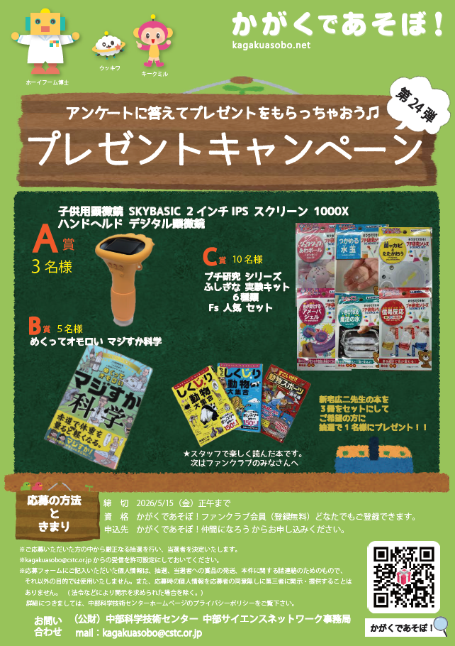※応募フォームにご記入いただいた個人情報は、抽選、当選者への賞品の発送、本件に関する諸連絡のためのもので、それ以外の目的では 使用いたしません。また、応募時の個人情報を応募者の同意無しに第三者に開示・提供することはありません。( 法令などにより開示を求められた場合を除く。) 詳細につきましては、中部科学技術センターホームページのプライバシーポリシーをご覧下さい。